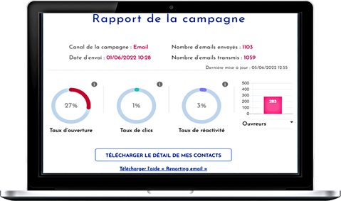 Mesurez la performance de vos campagnes en accédant à un rapport détaillé. La plateforme vous offre la possibilité de suivre les indicateurs clés de vos campagnes par le taux d'ouverture, le nombre de clics et le taux d'engagement. Ayez la possibilité de télécharger le rapport détaillé de vos contacts dans un fichier Excel.
